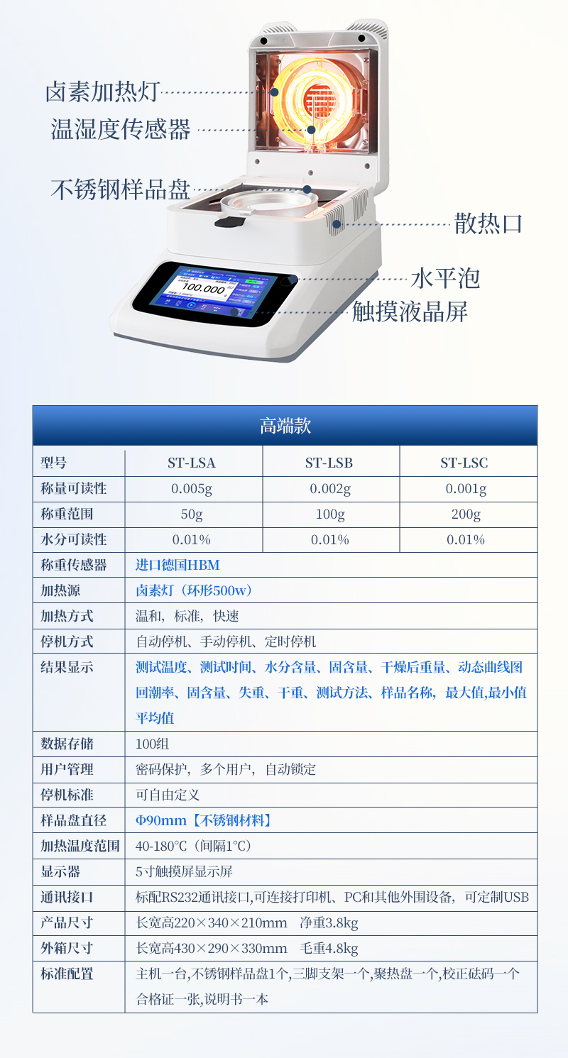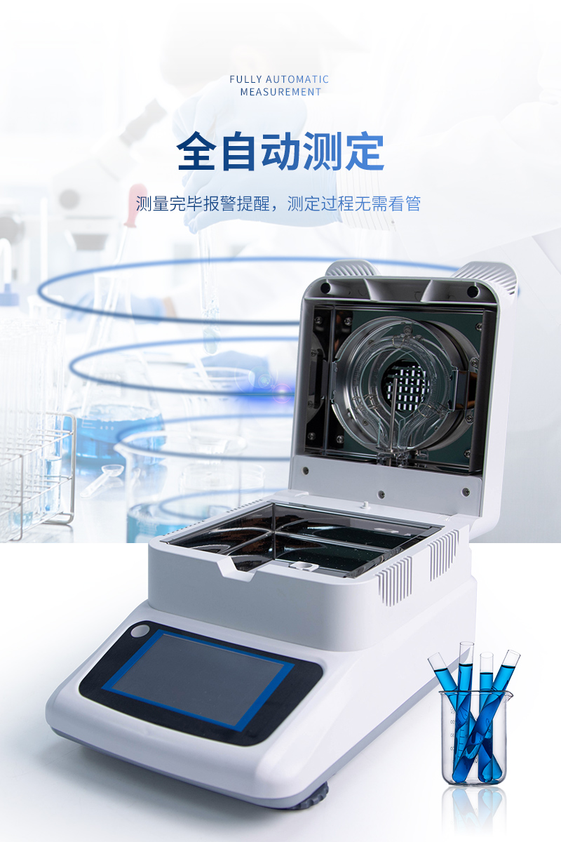 該系列快速水分測定儀應用了國際烘箱干燥法原理,測定結果與烘箱法水分測定具有良好的一致性,工作效率卻遠遠高于烘箱法水分測定,一般樣品只需要幾分鐘即可測量完畢,因此受到廣大用戶的青睞與好評。