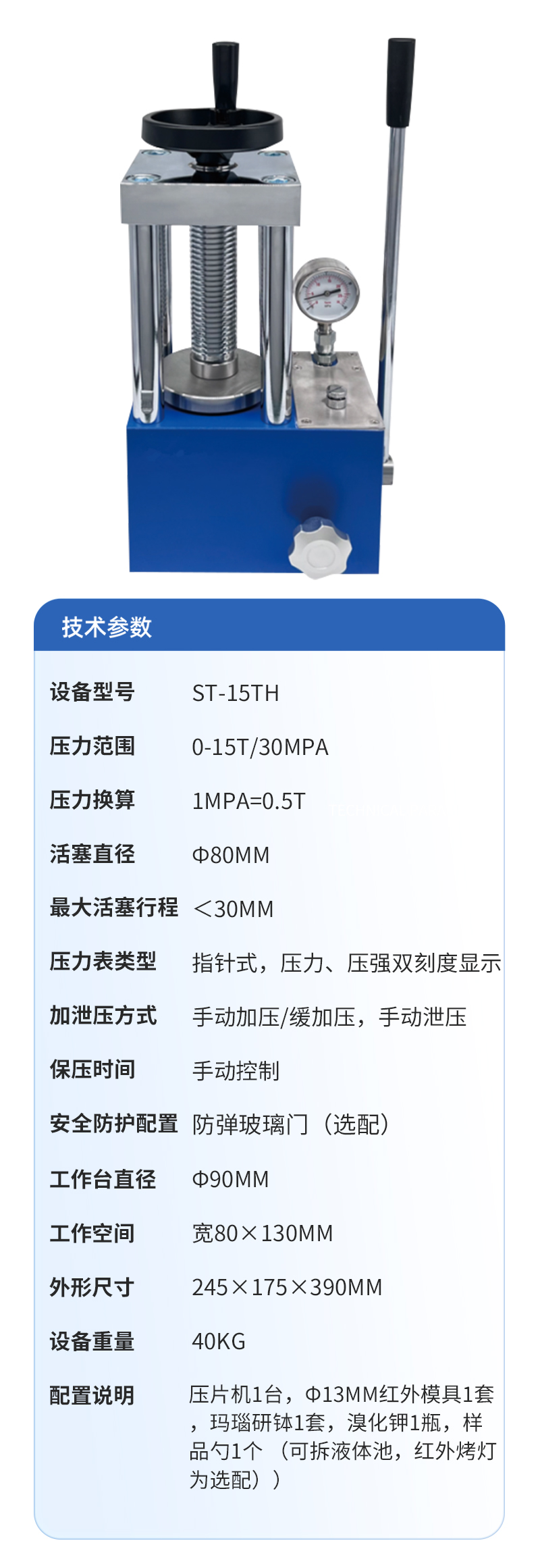 | 配置說明 | 壓片機(jī)1臺,Φ13mm紅外模具1套,瑪瑙研缽1套,溴化鉀1瓶,樣品勺1個 (可拆液體池,紅外烤燈為選配) |