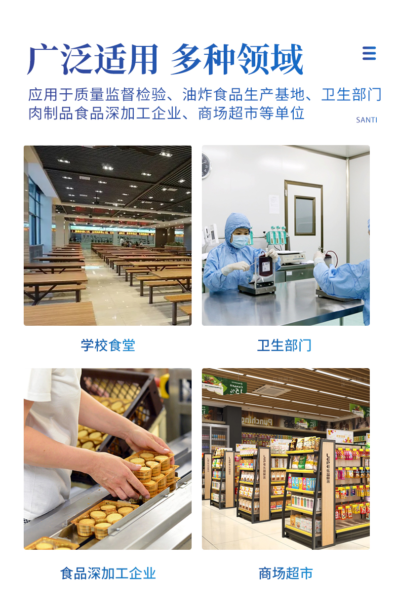 該過丙二醛檢測儀為集成化食品安全快速檢測分析設備,目前已于市場監管局、食品深加工企業、學校食堂、煉油廠、配送中心、商場超市等單位廣泛使用