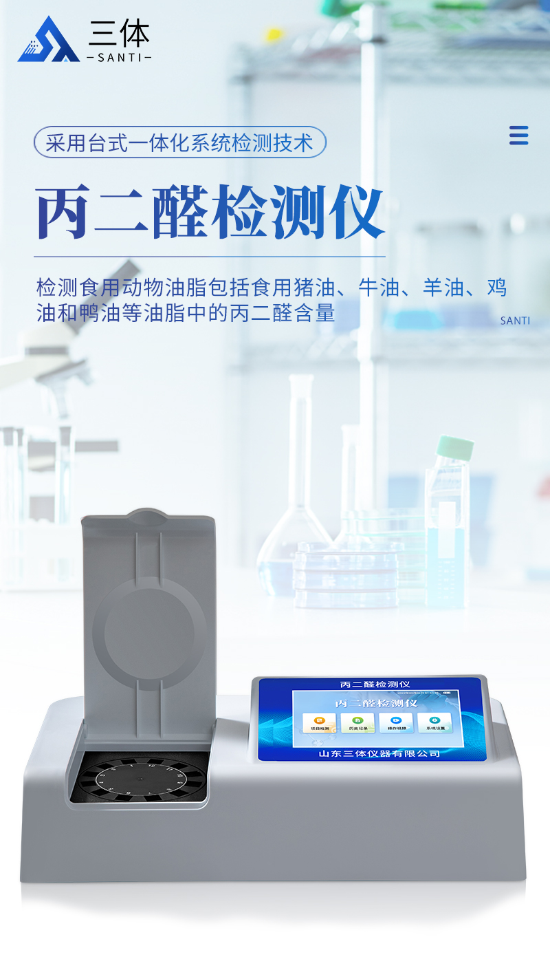 山東三體儀器有限公司生產的丙二醛檢測儀為集成化食品安全快速檢測分析設備,采用臺式一體化設計,能夠快速檢測食用動物油脂包括食用豬油、牛油、羊油、雞油和鴨油等油脂中的丙二醛含量;儀器預留其他項目檢測程序和端口,根據日后需求可進行遠程升級